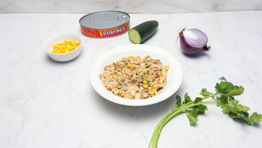 3. Arma la ensalada: En un bowl grande mezcla la pasta ya fría, las sardinas previamente trituradas, el pepino, la cebolla morada, los elotes amarillos y el cilantro picado. Vierte el aderezo encima y mezcla hasta integrar todo bien.