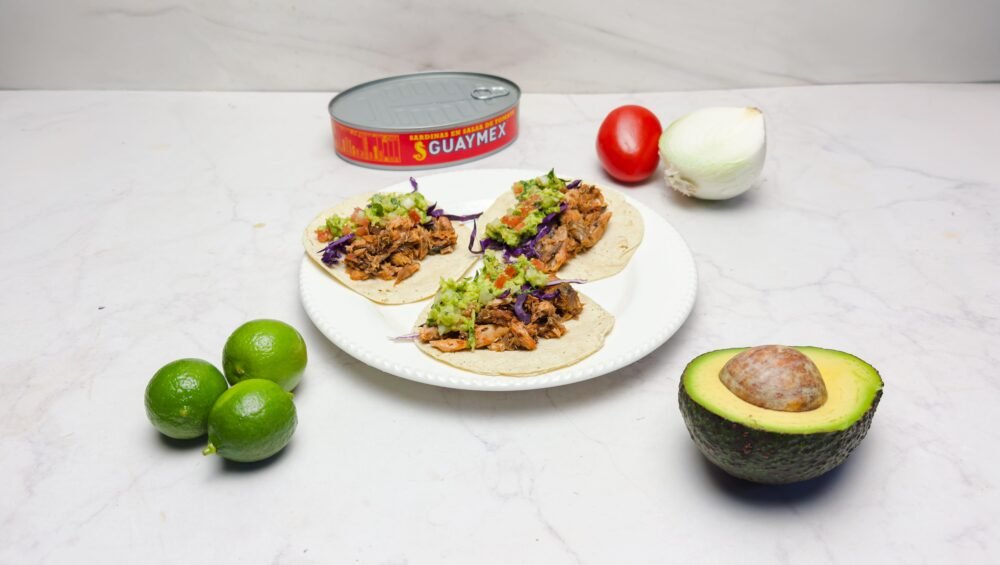 - Arma los tacos: Calienta las tortillas de maíz en un comal y agrega una porción de sardinas, una cucharada de guacamole y un toque de col morada.